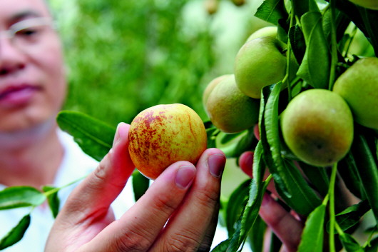 ◥16日,沾化冬枣专家拿着从市场上买到的假沾化冬枣在枣园里与真沾化冬枣实地对比。记者在现场看到,大批的冬枣还挂在枝头。 本报记者 王茜茜 摄
