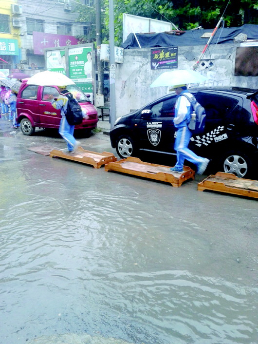 小学生正走在木板床搭起的“桥”上。图片来源于网络。