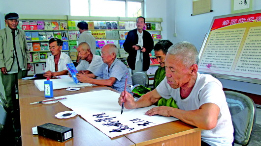 阅读室里,70岁的曹庆信老人正在写毛笔字,宣纸上“高楼幸福院,生活真美满”几个字道出了老人的心声。