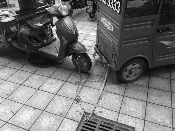 上午10点左右,民警驾驶两辆被暂扣的三轮车来到潍城交警五中队门口,拿出一根锁链将两辆车与雨水筛子锁到了一起。