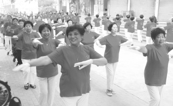 这个夏天,在德州市歌舞团门口,上百名老年人经常在人行道空地上跳起动感的广场舞(资料片)。 本报记者 王小会 摄