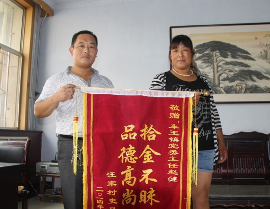当天,赵荣仙带着孩子史风景,来到车王镇政府,把一面“品德高尚、拾金不昧”的锦旗送到了办公室。“赵叔叔你真是个好人啊,我一定要向你学习,到了学校,我要把你的故事讲给同学们听,让大家都来学习你!”史风景开心地说。