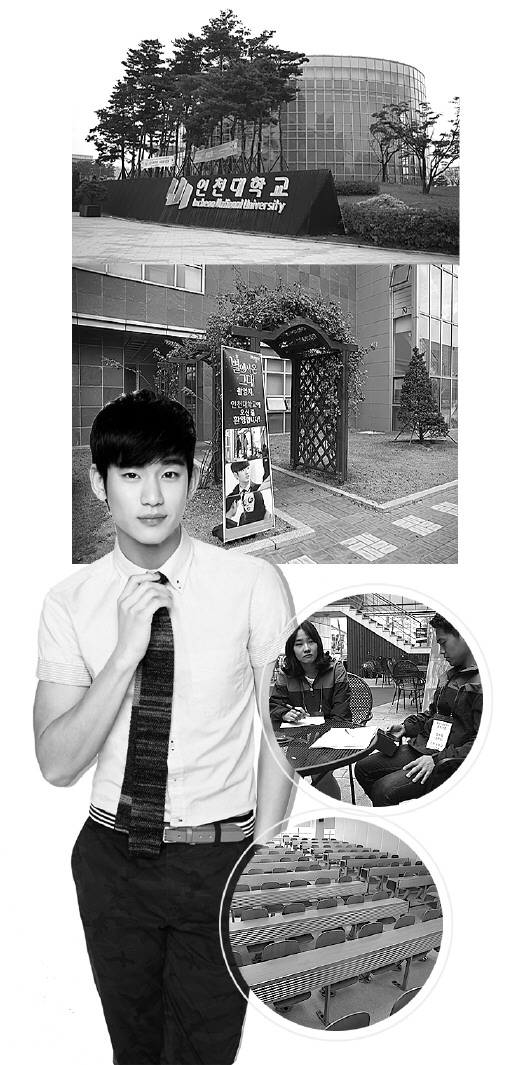 金秀贤的走红完全是因为电视剧《来自星星的你》。9月21日,记者探访了《来自星星的你》取景地仁川大学,来到“都教授”授课的教室,千颂伊坐过的咖啡街,俯瞰仁川市海景的瞭望塔。