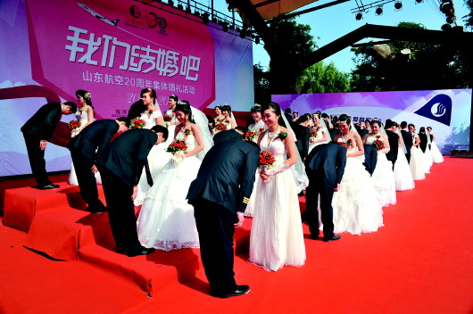 9月20日上午,济南泉城公园内,山东航空为32对公司新人举行“山航20年,我们结婚吧”大型集体婚礼。32对山航新人穿过山航“爱情号”舱门步入婚礼现场,踏着红地毯,走向爱情箴言板,写下彼此的爱情宣言。32对新人中一方或双方都是来自山航各个岗位的员工。有男空乘和女空乘的“同行”结合,有飞行员和女幼师的差异搭配,还有几对新人专程从青岛和烟台赶来参加集体婚礼。现场数百位观众共同见证了新人的甜蜜时刻。 记者 白新鑫 摄影报道