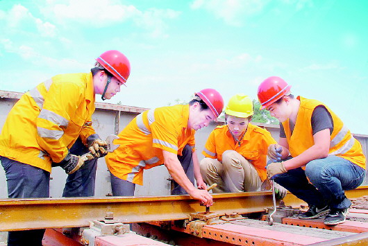 淄博工务段每年负责七八项钢梁桥大修更新施工,线路轨距一旦保持不住,易造成轨道电路短路。该段党员吕云祥带领攻关技术人员研制成功了新型直板式便梁扣件,已在全段推广。图为党员攻关人员忙碌在施工现场。 张婷 摄