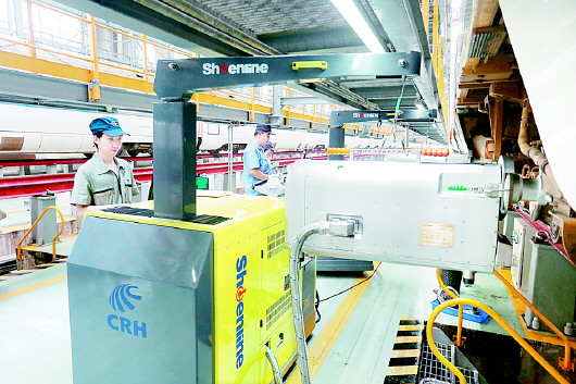 青岛动车段抓住暑运过后的有利时机,对动车组进行全面体检,按照运用动车组上线情况,对动车组车底进行包保,组成“一对一”包保验收小组,严格卡控作业流程,切实提高整修质量,确保运行状态良好。图为该段采取“双机作业”以提高动车组空心轴探伤效率。 吴华鹏 摄