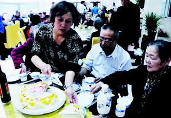 20日上午,任城区恒祥苑老年公寓餐厅内,140多位老人齐聚一堂,同庆九九重阳节,共享社区大家庭的温暖。和往年一样,午餐开始之前,每位老人领到了社区工作人员精心准备的寿桃、香蕉等水果和生日蛋糕,十几位工作人员帮老人们剥水果、切蛋糕、夹肉菜,忙得不亦乐乎。