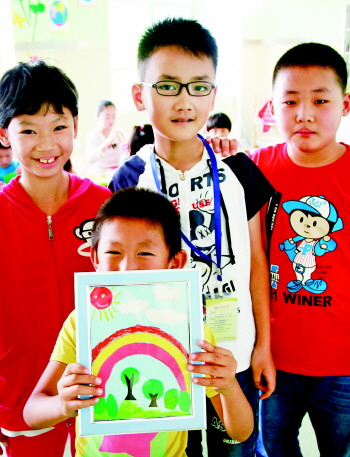 21日上午,本报走进市儿童福利院,不仅给“福娃”们送去衣服和食品,小记者还与“福娃”一起制作手工,共同完成一幅幅漂亮又充满童趣的手工制品。图为小记者们展示完成的作品。