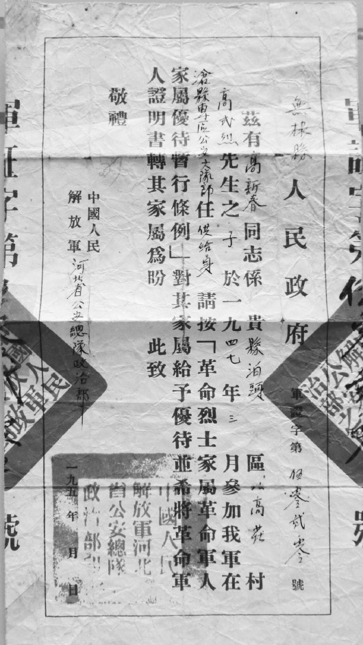 书信的具体内容是“无棣县人民政府,兹有高新春同志系贵县泊头区北高庄高式烈先生之子,于一九四九年三月参加我军在沧县专区公安大队任供给身,请按【革命烈士家属革命军人家属优待暂行条例】对其家属给予优待,并希将革命军人证明书转其家属为盼。此致!敬礼!”落款为中国人民解放军河北省公安总队政治部。时间是1950年,具体日期已经看不清楚了。
