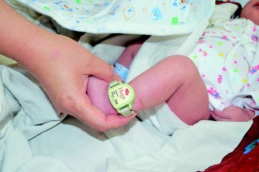 ▲防盗脚环绑在新生婴儿的脚腕上。