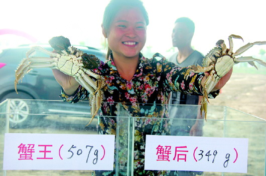 19日,黄河口大闸蟹开捕,今年的“蟹王”和“蟹后”分别重507克和349克。 本报记者 摄