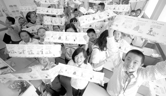 22日,在济南市十亩园小学,孩子们展示领到的《儿童安全成长手册》。 本报记者 王鸿光 摄