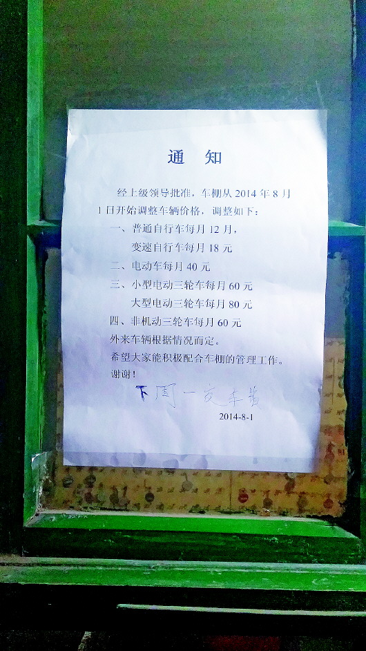 可是今年8月份车棚内贴出一张涨价告示,声称车棚今后开始全面涨价,而且涨价幅度非常大,几乎是翻倍上涨,自行车从6元涨到12元每月,大型三轮车从40元涨到80元每月。