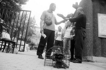 9月23日,田先生(左)将隼送至动物园,做放飞前的检查。 本报记者 马志勇 摄