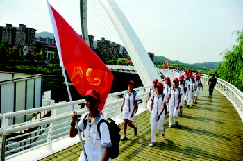 外出活动的学生都会统一穿校服。图为青岛58中学生野外拉练。 本报记者 张晓鹏 摄