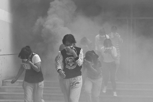 学生从“火灾现场“逃生。 本报记者 谭正正 摄