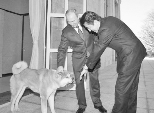 安倍晋三(右)今年2月8日在举行冬奥会的索契拜会普京,普京带着宠物狗与其会面。 (资料片)