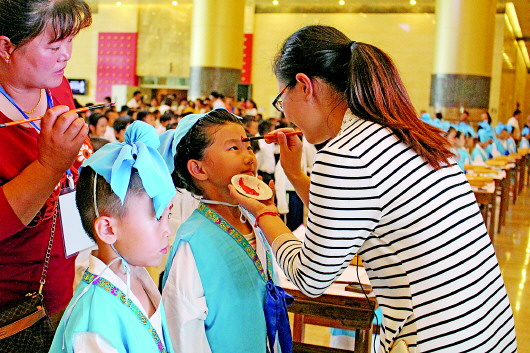 本报9月26日讯(记者 李飞) 9月28日是孔子2565周年诞辰,26日下午,山东博物馆孔子学堂为济南市姚家小学的300多名一年级学生举行开笔礼,点朱砂、写人字、送论语,小学生三鞠躬长揖拜孔子。