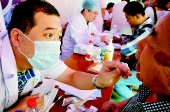 专家为患者检查口腔。 本报记者 王鸿哲 摄