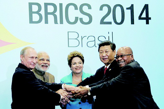 2014年7月,在巴西福塔莱萨举行的金砖国家峰会上,五国领导人握手。
