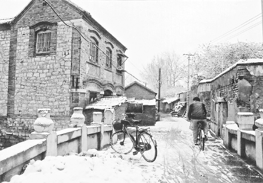 1877年增开坤顺门后,城外的大板桥街和马跑泉街一带渐成了交通要道及商业之地,那时大板桥以东的街段是集中卖小百货和妇女用品的地方,西段主要是做纸盒子的小铺。照片中桥首北的那座二层三间长的鸽笼式尖顶楼房,砖石墙体,拱形窗,老济南多有此建筑,较具代表性。临河一面墙是石块垒就,正门朝南的门窗,墙体为青砖,冬暖夏凉,坚固厚实。这原是一家旅店,供南来北往的客商休憩。