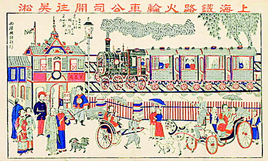 《上海铁路火轮车公司开往吴淞》为套色木刻,长44厘米,宽26厘米,印于1876年,描绘的是帝国主义在中国修建的第一条铁路——沪淞铁路开通后的情景。1875年,英商怡和洋行决定自上海至吴淞间修建一条铁路。吴淞是一个海港,商业繁荣,火车开行可以获得更大的利润。当时清政府对火车的态度正处于争论时期,洋务派主张引进火车,“采泰西之长技,助中国以自强”;保守派却视火车为“妖物”,怕引进后破坏大清王朝的风水。英国人怕遭到反对,就搞了一个骗局。表面上,他们说购买上海到吴淞间的土地是为了修建一条寻常马路,实际上却在筑路基、铺铁轨,并偷偷从英国运来了机车、车辆和其他铁路器材。1876年1月20日开始铺轨,2月14日以先期到达的仅重1吨多的小型机车“先导号”试车。