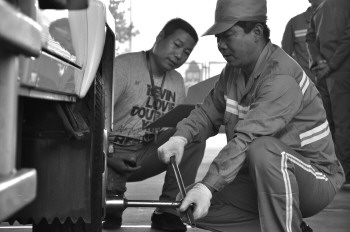 设备维修的比赛题目是更换清运车辆前轮胎,来自济宁市环卫处工人代表李为民在拆卸和安装螺丝时两手并用,同时拆卸或安装2枚螺丝,节省了大量的时间,最终出色完成比赛任务,获得该项目的第一名。