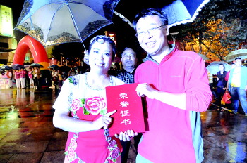 场上的比赛和演出很疯狂,场外的观众更是热闹非凡。起初大家只是冒着雨丝观看比赛,看到雨越下越大,有的观众甚至跑回了家,一会儿打着伞又跑了回来,把比赛场地围了个结实。年逾六旬的孙老汉只穿着一件外套,站在场外看得津津有味。“这些妇女,有个精神头!”对于广场舞“大妈”的疯狂劲,孙老汉一个劲儿地夸赞。