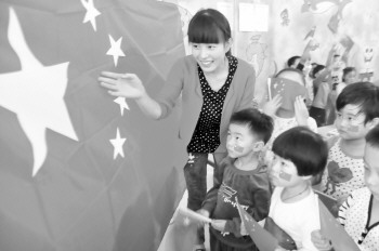 9月27日,聊城大学志愿者在国庆前夕走进天佑双语幼儿园,开展了“画国旗 迎国庆”活动,陪同孩子们一起制作小国旗,并且为他们讲解了国旗知识和红色故事,以此表达对祖国的美好祝福。 本报记者 张跃峰 通讯员 王登虎 韦鹏 摄