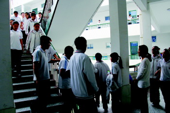 28日,张店二中学生在老师(右一)的监督下,按照学校规定的路线有序下楼。云南小学生踩踏事故发生后,市教育局于27日晚发布加强校园安全管理的紧急通知。28日,淄博各中小学迅速反应,设置安全监督员、规定各班学生上下楼路线、举行疏散演练,确保学生安全。 本报记者 谭文佳 通讯员 孙倩 摄影报道