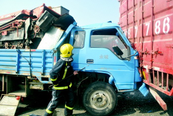 本报9月29日讯(记者 孙婷婷) 29日9时许,京台高速德州南收费站以南路东路段,由于道路发生堵塞,一辆大挂车减速慢行过程中,为躲一辆私家车,撞上了前方一辆蓝色的厢货,厢货随后撞向右侧车道的另一辆大挂车,三车相撞事故发生后,蓝色厢货内的两名人员被困。经德州经济技术开发区消防大队消防队员救援,驾驶员有轻微受伤,坐在副驾驶位置的女子头部受伤。