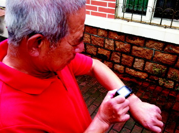 老人调试刚佩戴上的“孝亲手镯”。 蓝娜娜 摄