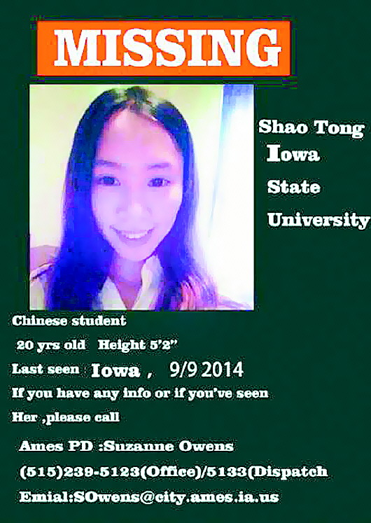 邵某现年20岁,是艾奥瓦州立大学大三学生。《艾奥瓦州日报》报道,邵某9月6日和7日前往艾奥瓦城过周末并看望一位中国留学生朋友。警方说,邵某9月8日最后一次与朋友联系。