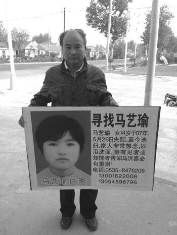 “马艺瑜,女,14岁,山东省烟台市招远市南泊子村人,圆脸,大眼睛,眉毛较浓密,睫毛长,当时扎马尾辫,失踪时穿灰色上衣,蓝色牛仔裤,绿色凉鞋,2007年5月26日下午出去玩,再没归来,联系电话13001622006。”