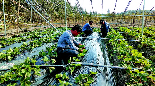 记者见到翟涛时,他和妻子正跟另外两位工人一起为农场里的草莓苗铺设地膜。将黑色的塑料膜铺在土地上后,翟涛熟练地在膜上挫出一个小洞,然后将苗子轻轻拉出,每棵草莓苗都侍弄好后,最后平整地膜,再继续为下一茬草莓苗铺膜。