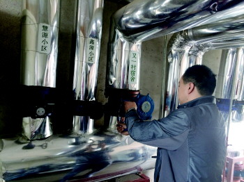 10月9日上午,在堤岭换热站,工作人员调试小区二级管网阀门并注水试压。 贺莹莹 摄