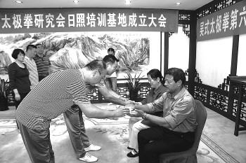 北京吴氏太极拳研究会日照培训基地日前成立,现场举行了吴氏太极拳第六代传人田德文先生收徒仪式。