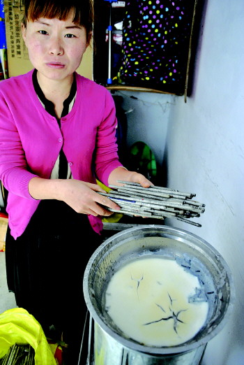 八位市民都表示,厂家第一次发来的报纸、胶水、铅芯等原材料质量较好,一开始生产出的几百支实验品基本都合格,但之后发来的原材料特别是胶水与第一批不一样,直接导致产品不合格。在张女士家,记者见到了第二批胶水制成的铅笔半成品,气味刺鼻,几百支铅笔粘连在一起。岳女士说,这些胶水制成的铅笔晾晒二十天都不会干,捆在一起就会粘连。按照合同约定,原材料由厂方提供,部分原材料加工方可以从市场自行购买,但并没有说明哪些可以购买。加工者们说,他们担心使用外面的原材料更会被厂家挑拣,只用厂家的材料,没想到还是不合格。