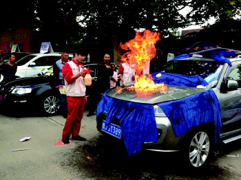商家推出各种有趣活动,让市民参与互动,比如创新汽车推出“抢钱”活动,具体玩法是订车客户钻进一个透明充气箱子,鼓风机吹起纸币,不断飘到他身上,抓到多少都算作给他的奖励。为展示一款汽车美容产品,一家4S店邀请市民砸车,还将车前盖点燃,测试车漆性能。