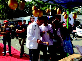 不少商家临时增加了砸金蛋活动,给市民送礼品,东风标致请人装扮成品牌形象“小狮子”吸引市民围观。