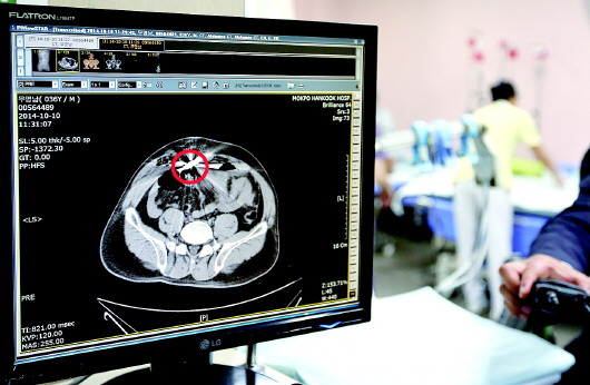死亡的中国船长的CT扫描图。图像显示其左侧腹部有中弹的枪伤,体内还留有子弹残骸。