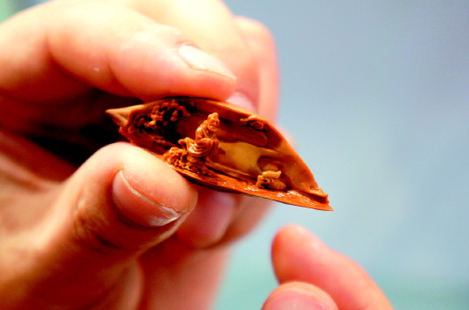 来自青岛的核雕艺术家莫子创作的核雕人物惟妙惟肖。