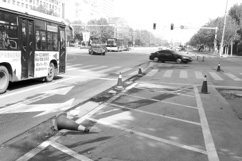 10日上午,迎春大街多处挖出的坑旁边设有锥形筒,但部分锥形筒被过往车辆撞倒轧扁。 本报记者 韩逸 摄