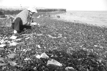 10日,住在海边的孙女士在栈桥附近捡拾海菜,有风浪的时候这里经常会涌上大片海菜,其中不少是可以食用的。每当风浪过后,就会有市民过来捡海菜。