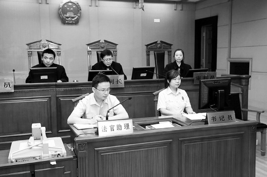 9月25日上午,上海市人民法院一法庭内,案件有条不紊审理中。与往常不同的是,书记员的席位旁多了一个法官助理席签,新上任的黄海涛正不时传送各种庭审文件。