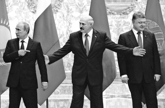 俄罗斯总统普京(左)与乌克兰总统波罗申科(右)8月26日在白俄罗斯总统卢卡申科(中)的撮合下举行过一次会晤。(资料片)
