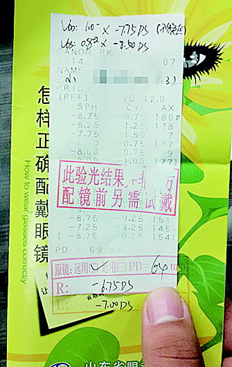 经过验光师的检测,记者在五家眼镜店得到的结果分别为:左眼,800度、850度、800度、825度、850度;右眼,700度、750度、850度、825度、750度。而山东省眼科医院和济南眼科医院做出的验光结果分别为:左眼,850度、850度;右眼,775度、800度。
