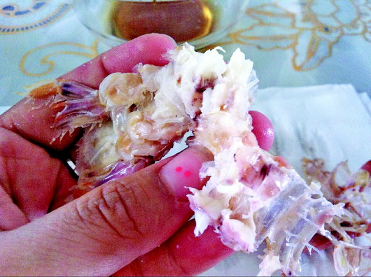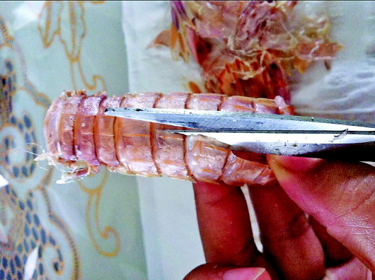 记者先把尾部最外面两个小脚拧断,然后捏着尾部轻轻往上一折,再拧掉,尾巴上的肉就出来了。随后,记者用根筷子从尾部贴着虾壳插到头附近,左手把壳折开,右手按筷子,两手同时反方向用力,背部整个壳就掀开了。