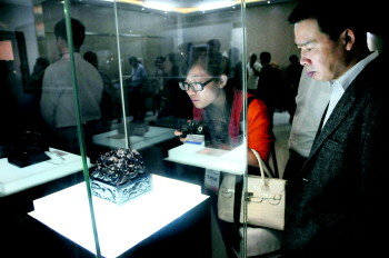 宝石博物馆里展出的蓝宝石吸引了市民的目光。 本报记者 孙国祥 摄