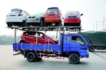 9日下午,一辆搭载了5辆汽车的小型货车在京台高速鲁冀收费站广场被执勤民警查获。
